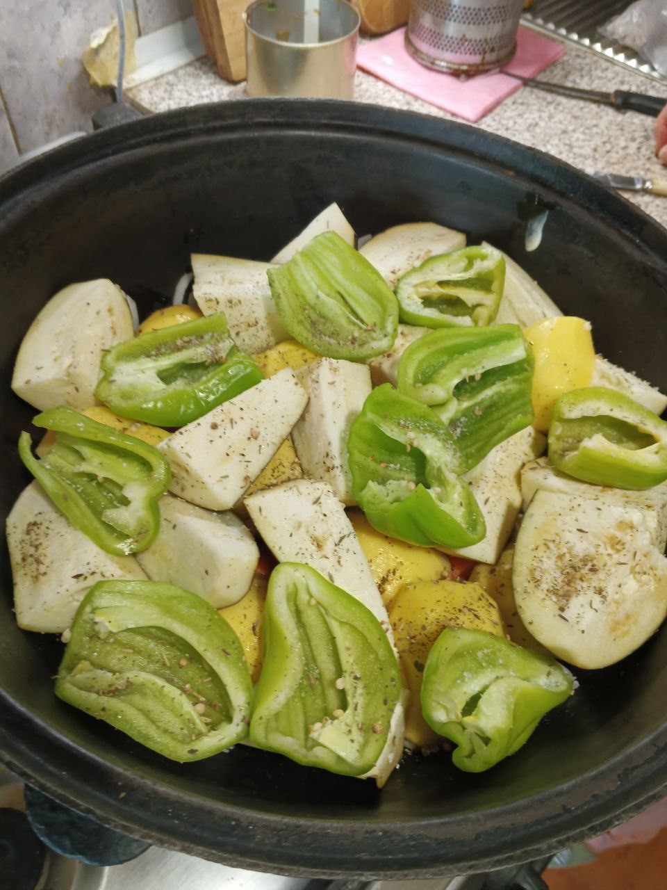 Нарезаем баклажаны крупно и болгарский перец и утладываем следующими слоями