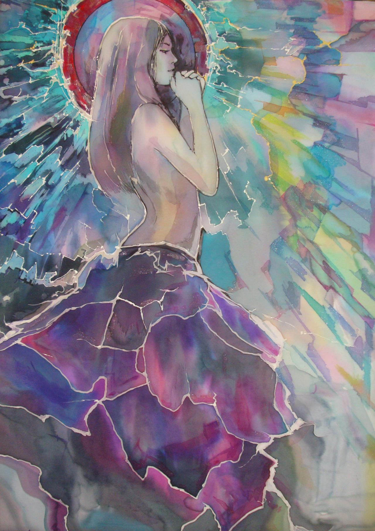 Хотел постить на конкурс изначально другую работу. Тоже шёлк на подрамнике 90x70. Из за фарша в ИРЛ тупо не успел её дописать(( И вломил песеля за световой день. Се ля ви.