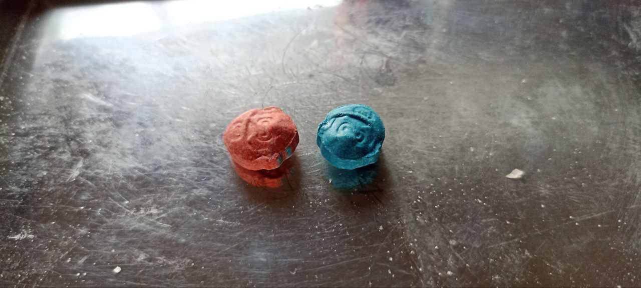 Два колеса, оказались как в матрице, одно синее, другое красное, с этими цветами отдельно было весело уже в процессе, но об этом будет ниже. У магазина уточнил по содержанию: 200мг МДМА+20мг МДА в каждой.