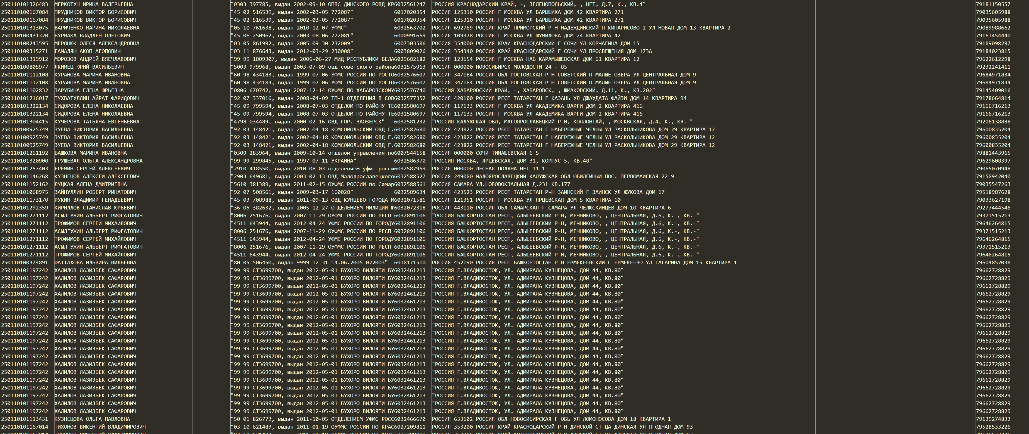 Данные:IMSI,ФИО,ИНН,Паспорт,Лиц. счет,Адрес факт,Адрес юр.,Телефоны,e-mail,DEV_NAME,Тариф,Телефон,Дата контракта,Дата начала