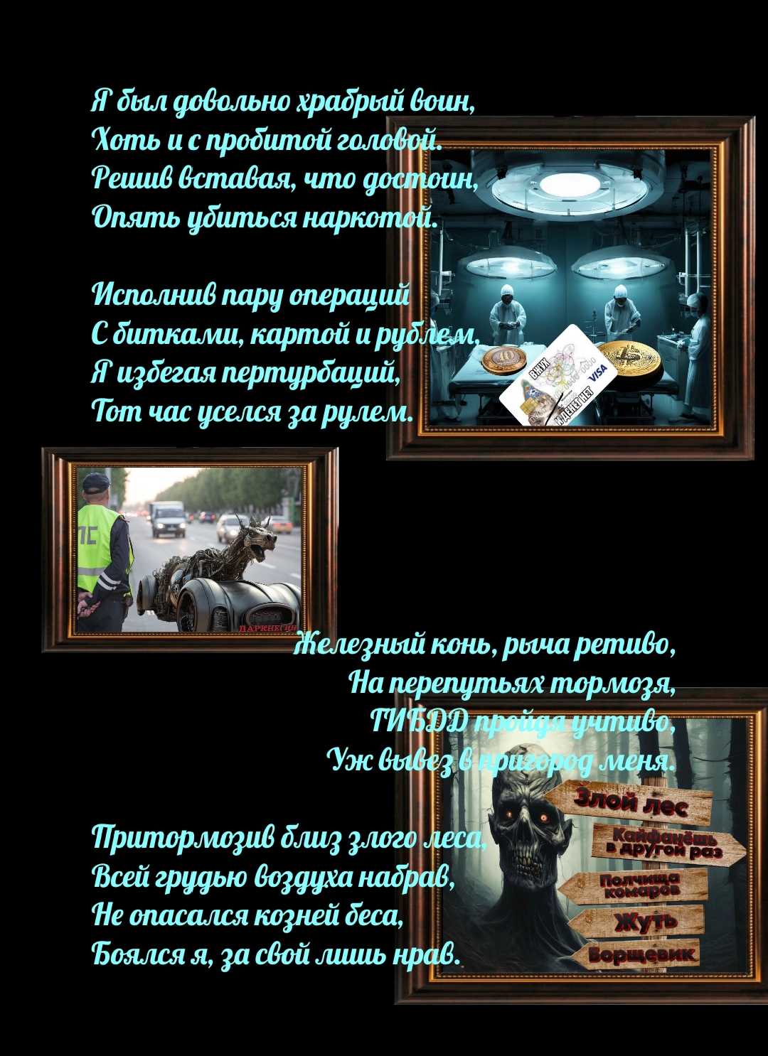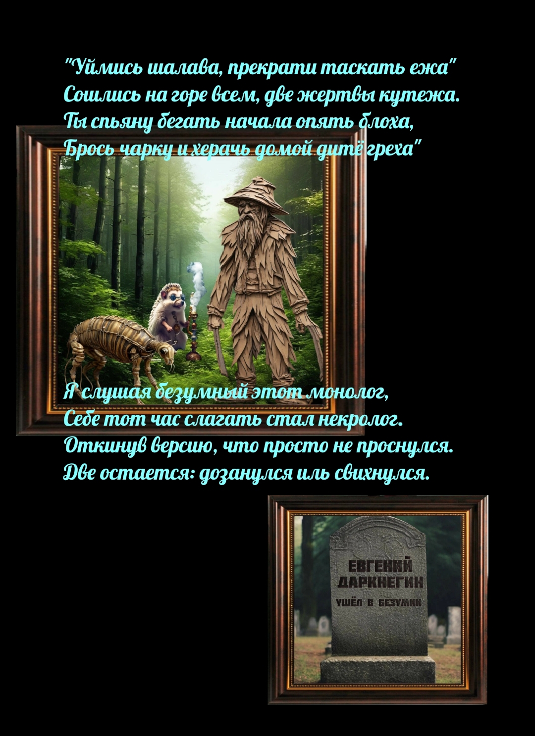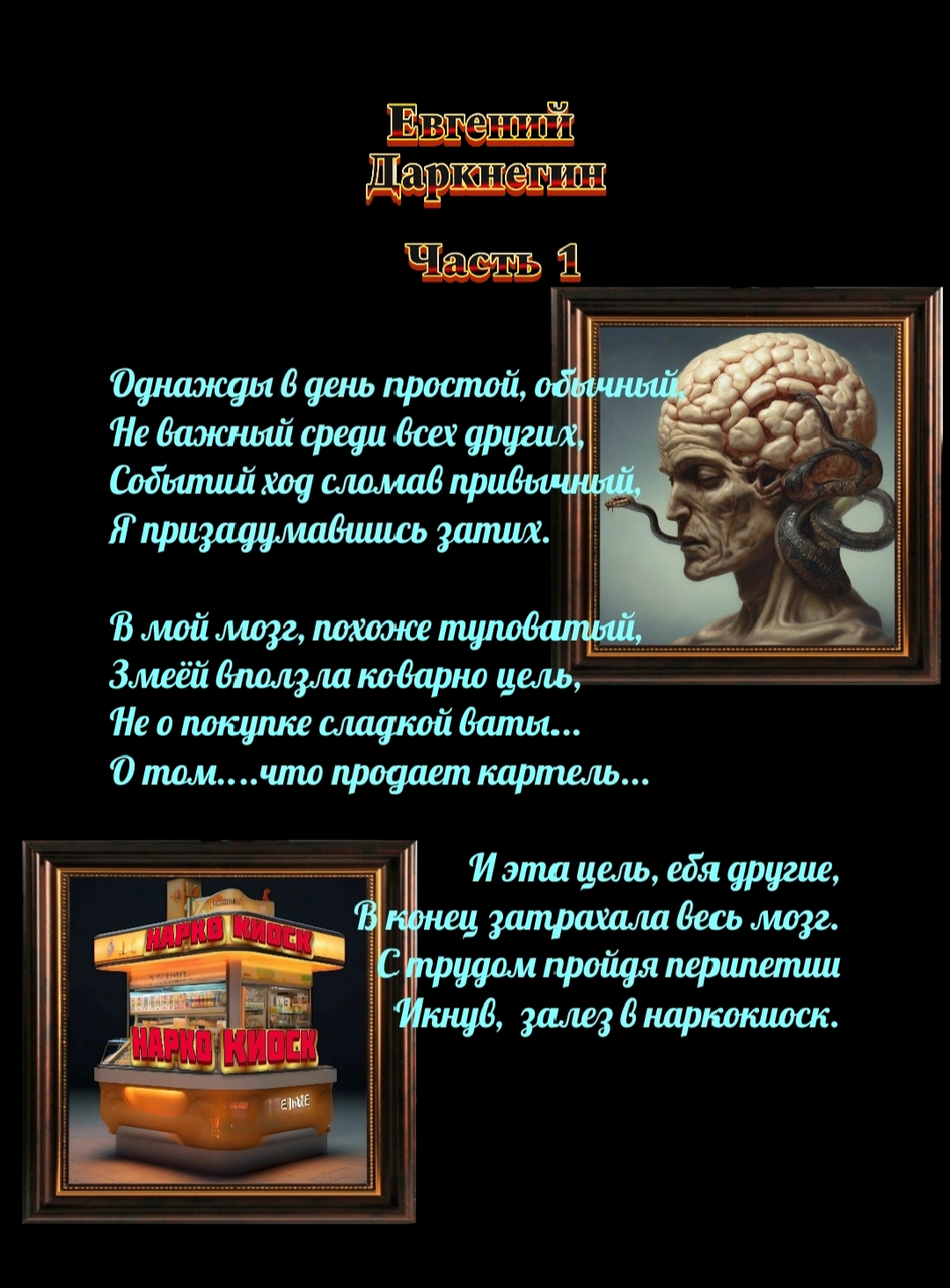 ЕВГЕНИЙ ДАРКНЕГИН Однажды в день простой, обычный Не важный среди всех других Событий ход сломав привычный Я призадумавшись притих. В мой мозг, похоже туповатый Змеёй вползла коварно цель Не о покупке сладкой ваты... О том....что продает картель... И эта цель, ебя другие В конец затрахала мой...