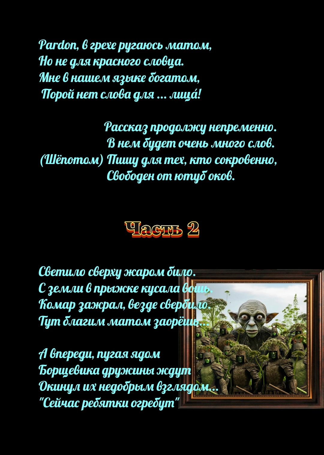 Да, к сожалению это многобуквенная дребедень... Толстой называл Войну и Мир многословной белибердой, но я ж не Толстой, потому пока с буквами упражняюсь... Но я работаю на улучшением и улегчением для читателя, плавно перемешивая с картинками... Далее планирую комиксы, потом просто картинки, а как финальную цель вижу одну все объясняющую фотку... Эдакий ключ к сознанию... Взглянул разок и словно Войну и Мир прочел.